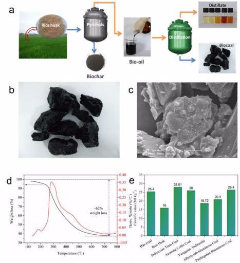 生物質(zhì)原料(農(nóng)林廢棄物和有機固體廢物等)通過熱解得到的生物油(bio-oil)是一種可再生資源,國內(nèi)外研究者一直致力于生物油的催化提質(zhì)和分離,期望獲得高附加值的化學(xué)品或優(yōu)質(zhì)燃料。然而,生物油的成分復(fù)雜且不穩(wěn)定,通常包含數(shù)百種有機化合物。在催化過程中,部分有機物發(fā)生縮合、脫水、結(jié)焦等反應(yīng),導(dǎo)致催化劑失效,使催化提質(zhì)過程難以持續(xù)。同時,常用的分離手段,如常壓蒸餾或分子蒸餾條件下,生物油快速結(jié)焦,阻礙蒸餾的進一步進行。課題組研究發(fā)現(xiàn),通過常壓蒸餾過程參數(shù)控制,實現(xiàn)生物油快速結(jié)焦可以得到一種新的固體燃料(命名為生物煤,bio-coal)。分析顯示不同生物質(zhì)原料(稻殼、鋸末、麥秸稈、甘蔗渣、大豆秸稈等)得到的生物煤熱值在25-28MJ/kg,與商用煤熱值相當(dāng)。且生物煤具有性能穩(wěn)定、低含硫量、不含重金屬等環(huán)境友好性。模型研究還表明我國生物煤生產(chǎn)潛力可達(dá)402百萬噸標(biāo)準(zhǔn)煤。